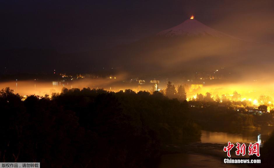 当地时间2015年5月10日,智利普孔,夜间看到的喷发的维利亚里卡火山。
