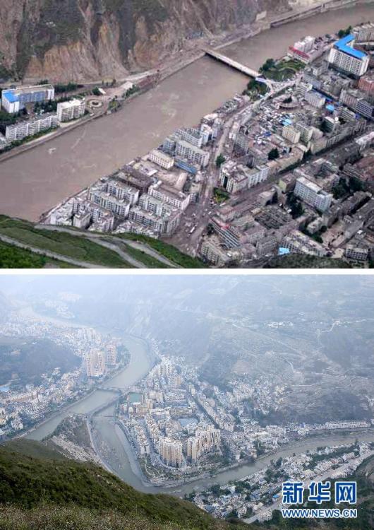 上图:2008年5月14日航拍的地震后的四川省汶川县县城(新华社记者徐壮志摄);下图:2015年5月6日从空中俯拍的四川省汶川县县城(罗国杨摄)。 5月12日是汶川地震七周年纪念日,经过7年的重建和恢复,地震中损毁严重的汶川获得新生。 新华社发 图片来源:新华网