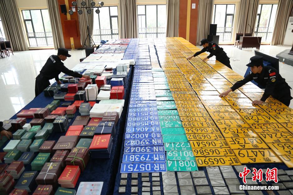 贵州州省公安厅5月13日举行新闻发布会通报称,贵州警方通过户外张贴的“野广告”入手,成功摧毁两个相关联的横跨多省,集产、供、销为一体的特大制贩假证件、假车牌犯罪团伙,案值金额高达2600余万元人民币。警方先后共抓获主要犯罪嫌疑人26名,捣毁制假窝点多处,收缴制模机7台、全国各省水印制假模板16块、涉及全国多地的各类假车牌5.5万余副,各类假证件5.1万余本。图为警方收缴的涉案物品。中新社发 钟欣 摄
