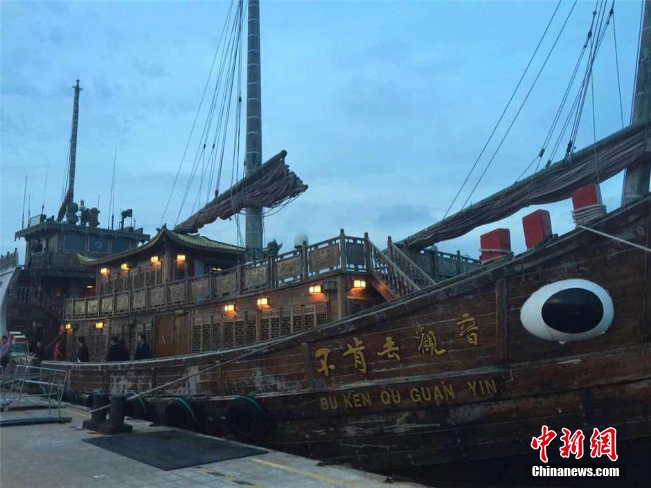 夜幕降临,浙江省舟山市的“十里渔港”绵延数里,与渔火交相辉映,仿古木船穿越阑珊灯火成为一道灿然的风景。5月13日,由普陀山投资2000多万元打造的“不肯去观音号”仿唐古帆船试水航行,木船沿袭了旧时古朴风貌,穿越普陀山、沈家门渔港、观音大桥、印象普陀等地,游客通过体验传说中莲花洋航行经历,远眺渔港风光,观浪听海,领略海洋文化及普陀禅意的独特魅力。姜玲 摄