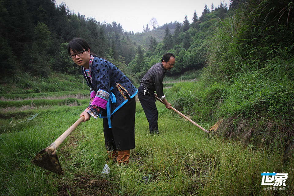 2014年4月15日,在广西柳州市融水苗族自治县安陲乡江门苗寨,女大学生村官杨宁在田间除草。 CFP