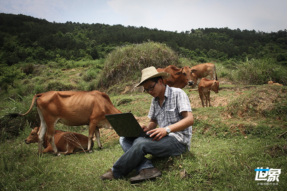 2012年5月22日,湖北黄冈,贺根在山坡上放牛的间隙,打开笔记本电脑学习养牛,了解行情。 CFP