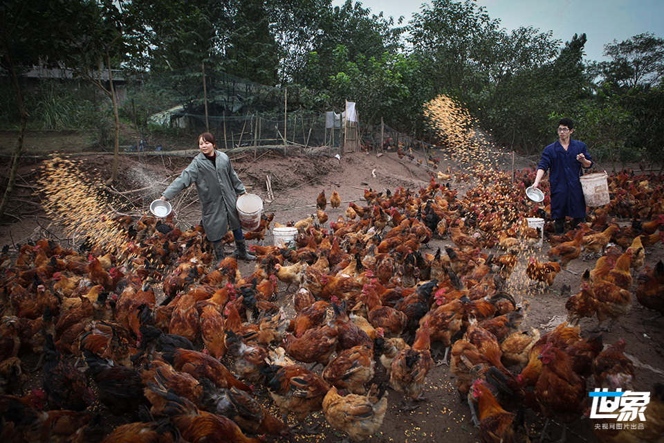 2013年11月10日,四川省内江市,85后大学生夏韬滔和女友王俊正在用粮食喂鸡。 CFP