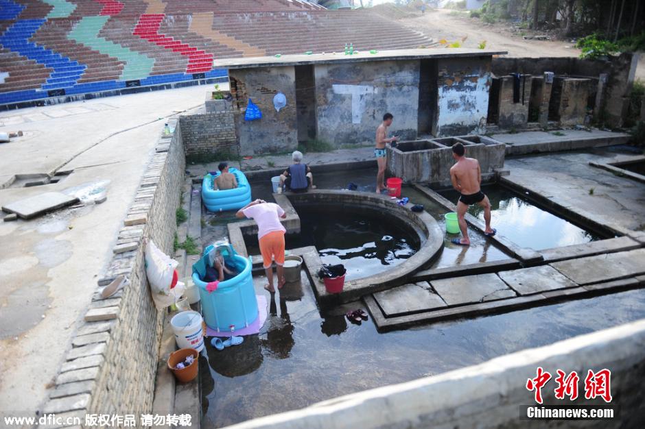 2015年5月13日,海南省三亚市文物保护单位、崖州古迹之一的“既济亭热水池”由于长期以来无人管理,水量越来越少,成了附近居民的露天澡堂。该温泉的修建历史可上溯到明正德年1506到1522年间。图片来源:东方IC 版权作品 请勿转载