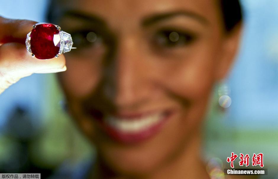 5月14日消息,一颗25.59克拉的缅甸红宝石以超过3000万美元落槌成交,远高于苏富比拍卖行预估的1200万至1800万美元,创下了红宝石的最高成交价纪录。这颗珠宝叫“日出红宝石”,属于罕见的“鸽血红”等级。图为5月6日,工作人员展示鸽血红宝石。