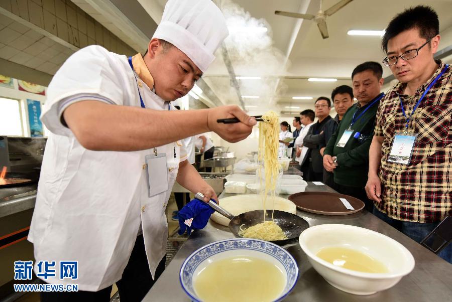 当日,江苏省淮安市举办面条类金牌旅游小吃选拔大赛,40多名选手参加了该赛事。大赛要求选手在15分钟内完成自选品种面条的制作,评委就参赛面条的“浇头、熟面条、汤汁、营养卫生”四方面给予综合打分。此举旨在弘扬淮扬菜系的饮食文化,促进当地旅游餐饮的健康发展。 新华社发(曹政 摄)