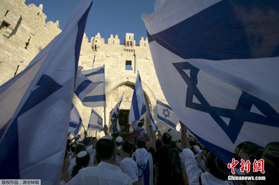 当地时间2015年5月17日,耶路撒冷,犹太复国主义者游行集会,庆祝“耶路撒冷日”。数万名以色列人进入耶路撒冷老城的穆斯林区游行,庆祝第48个“耶路撒冷日”,引发巴勒斯坦示威者与以色列警察的冲突。以色列庆祝“耶路撒冷日”是为了纪念在1967年第三次中东战争中夺得耶路撒冷全城控制权。耶路撒冷地位问题是巴以和谈的关键之一。以色列1967年占领东耶路撒冷后将其吞并,并单方面宣布整个耶路撒冷是其永久的不可分割的首都,但至今未得到国际社会认可;而巴勒斯坦方面则一直要求将东耶路撒冷作为其未来国家的首都。