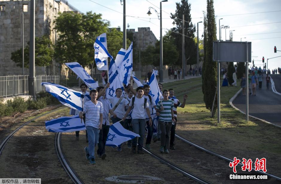 当地时间2015年5月17日,耶路撒冷,犹太复国主义者游行集会,庆祝“耶路撒冷日”。
