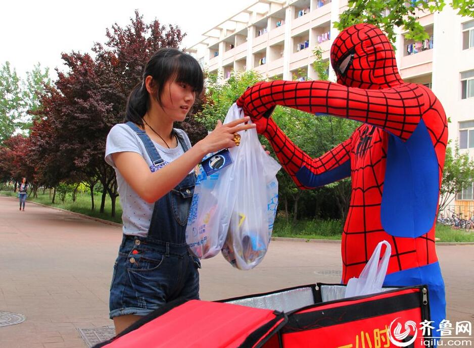 图为“蜘蛛侠”外卖哥把零食商品送到订购商品的同学手中。赵映泉 摄 图片来源:齐鲁网