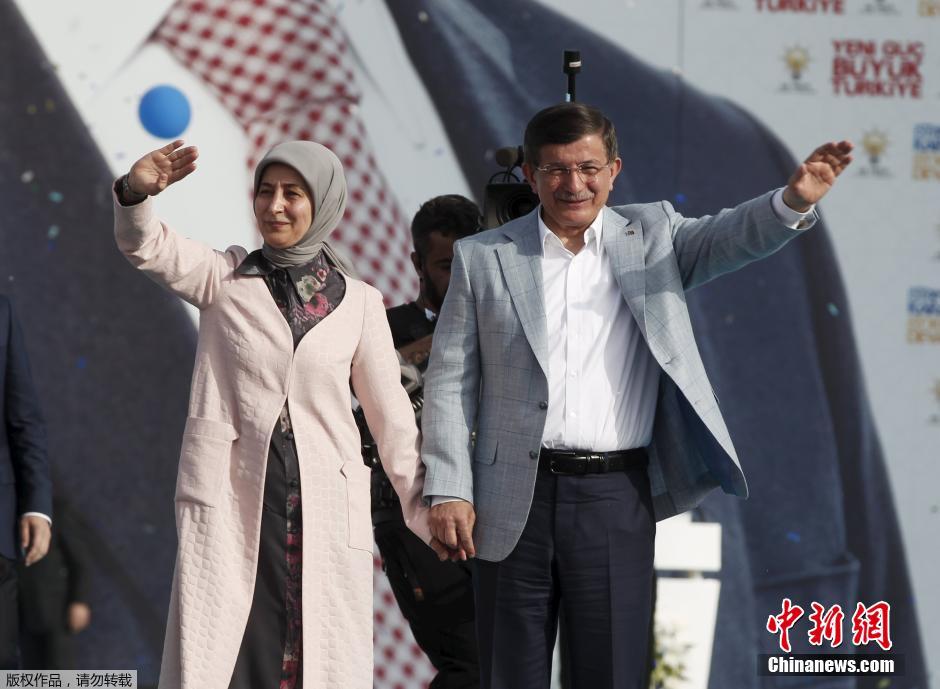 当地时间2015年5月17日,土耳其伊斯坦布尔,土耳其总理达武特奥卢和妻子Sare出席竞选集会。土耳其将在6月7日举行议会选举。
