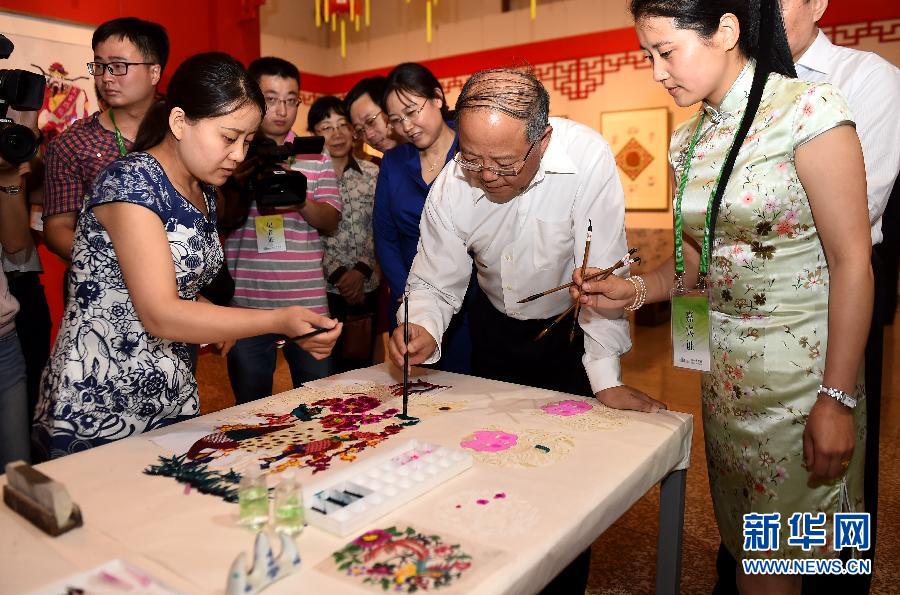 5月18日,国家文物局局长励小捷(右二)在河北博物院“蔚县剪纸”特展上为剪纸点彩。新华社记者金良快摄