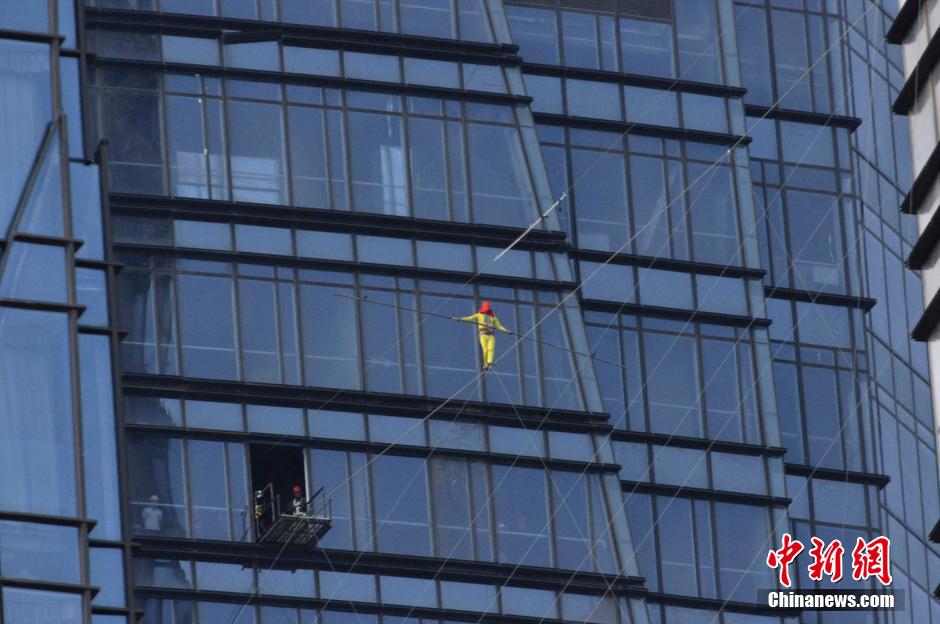 5月16日18时,“高空英雄”艾斯凯尔挑战中国最高双塔的昆明万达广场300米双塔,并成功冲击蒙眼倒走钢丝世界纪录。本次挑战的楼层是双塔中部第32层,距地面150米,艾斯凯尔用红布包头蒙住双眼,倒走钢丝,从南塔用时6分40秒成功走至北塔。随后艾斯凯尔又数次往返双塔并完成一些高难度的高空表演。 中新社发 李伟华 摄