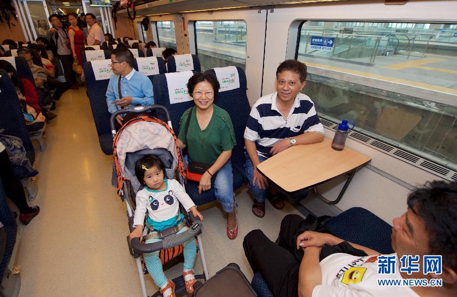5月18日,乘客乘坐首趟“清新福建”号D2323次动车出行。当日,“清新福建”号动车组冠名仪式在福州火车南站举行。上午9时36分,车身绘有“清新福建”字样的D2323次动车从福州开往深圳,由此开启了福州至深圳、上海、北京这三条热点线路冠名动车组“清新福建”号的行程。新华社记者姜克红摄