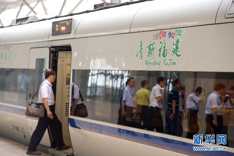 5月18日,乘客走进首趟“清新福建”号D2323次动车出行。当日,“清新福建”号动车组冠名仪式在福州火车南站举行。上午9时36分,车身绘有“清新福建”字样的D2323次动车从福州开往深圳,由此开启了福州至深圳、上海、北京这三条热点线路冠名动车组“清新福建”号的行程。新华社记者姜克红摄