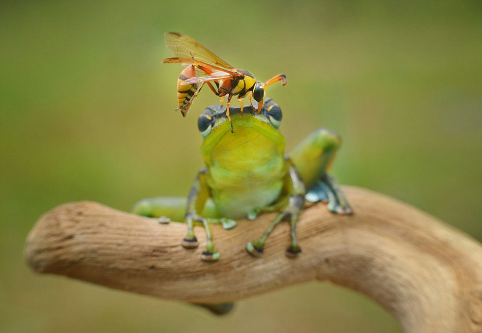 国际在线专稿:据英国《每日邮报》5月17日报道,印尼三发(Sambas)17岁摄影师弗兰基·荣格日前抓拍到惊人一幕:一只大黄蜂落在树蛙头顶上,将其驯服。这只树蛙保持一动不动的姿势长达5分钟,以确保不会被大黄蜂蜇伤。