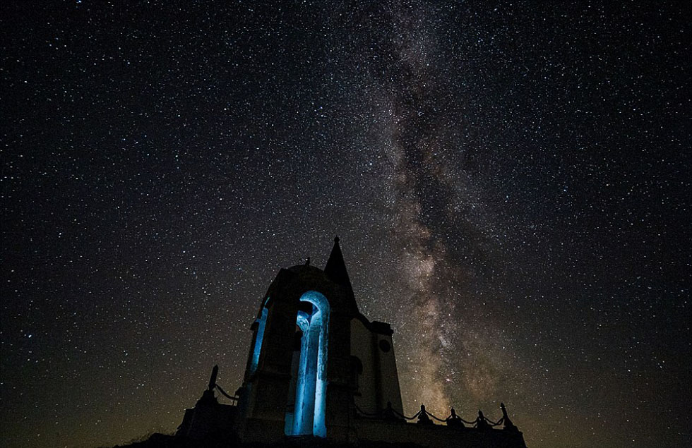 一座废弃的希腊教堂散发出怪异的蓝光,背景则是银河。(网页截图)