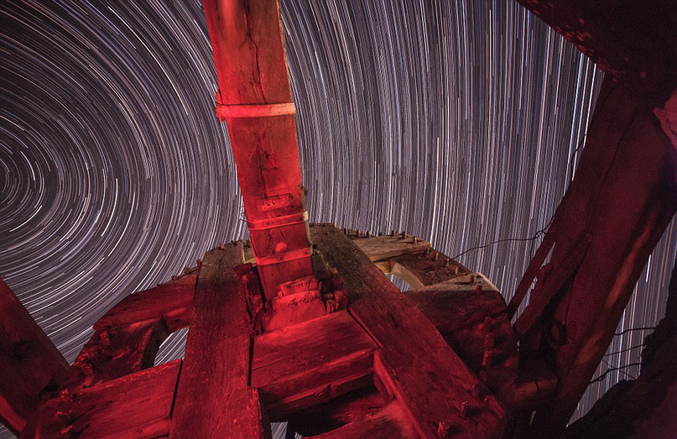 在银河系的衬托下,废弃的希腊教堂显现出惊人的深红色。(网页截图)