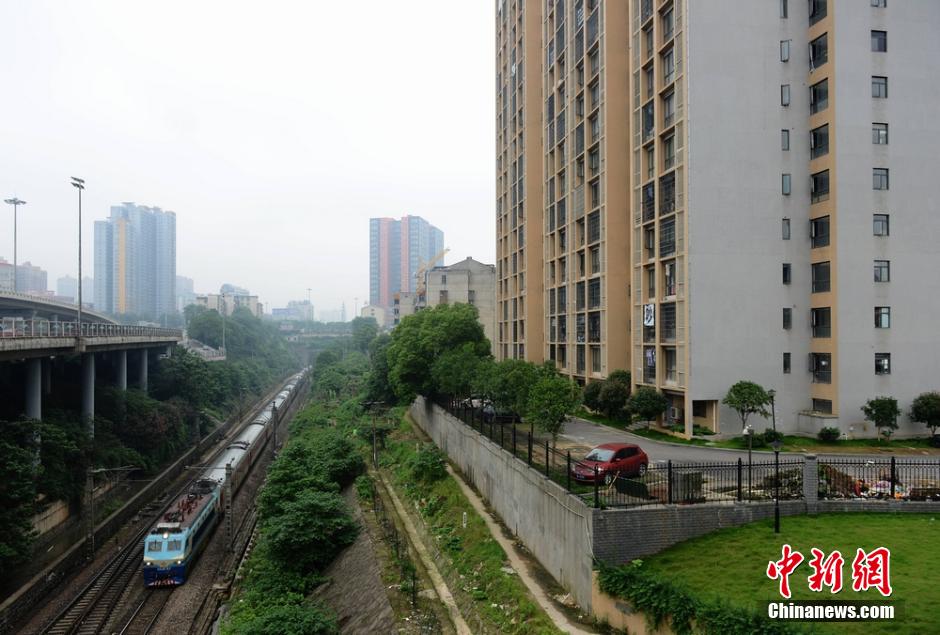 5月18日,火车鸣长笛在该居民楼一侧经过。杨华峰 摄