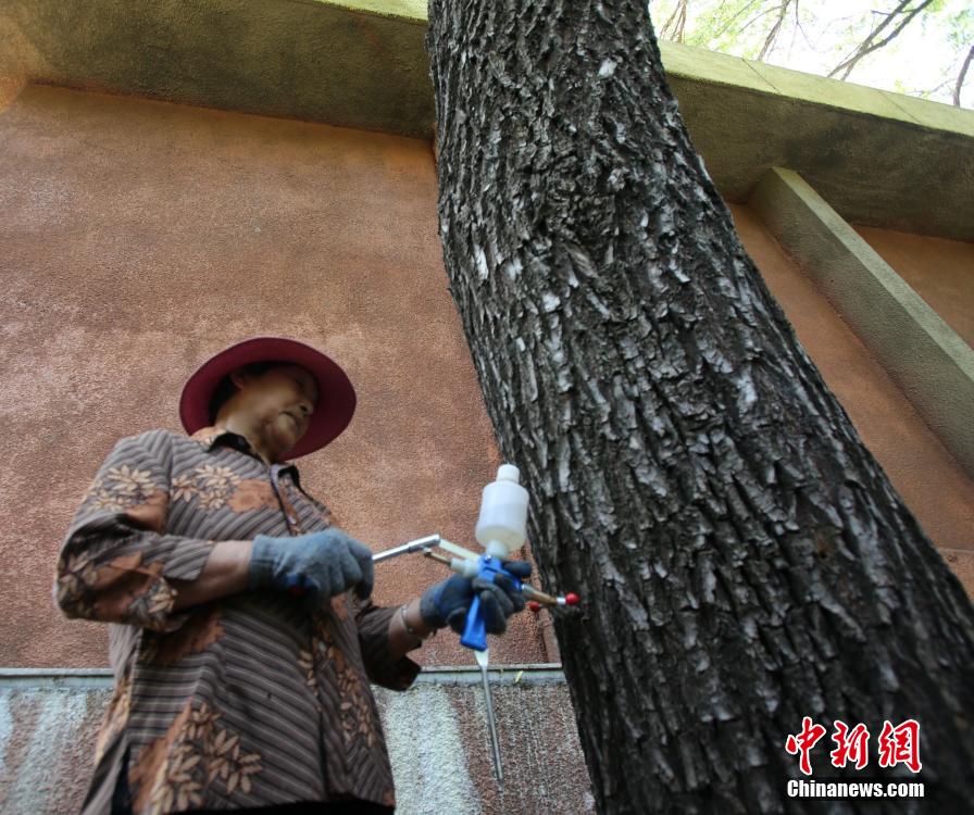 5月18日,河南郑州动物园,园林工人手持电钻,在杨柳树上钻出小孔,再注射进去药液。园林工人说,他们这是在为雌性杨柳树“避孕”。“郑州市动物园现有杨柳雌株近700株,柳树548株,杨树142株。每年这个时候,就会出现‘五月飞雪’的景象,不少游客都反映飞絮吸入呼吸道、飞入眼睛,对园区卫生环境和景观环境造成严重破坏。”为了抑制杨柳飞絮,动物园专门购买了一百余瓶“抑花一号”,也就是杨柳科植物的“避孕药”。据了解,“抑花一号”杨柳飞絮抑制剂采用树干注射的方法将该药别注入树干内,药液随蒸腾作用扩散到树冠各个部分,抑制杨柳树花芽形成,从而达到控制杨柳飞絮的目的。王中举 摄