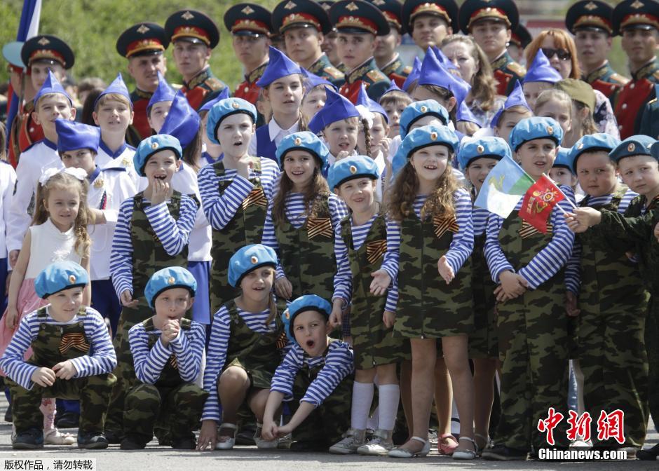 当地时间2015年5月14日,俄罗斯罗斯托夫,儿童们穿着军装参加游行,纪念卫国战争胜利70周年。约500名4岁至10岁的儿童参加。