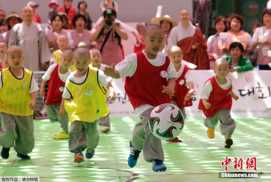 当地时间2015年5月14日,韩国首尔,曹溪寺举办“小和尚足球赛”,可爱的小和尚们踢球时动作灵活,表情超萌。