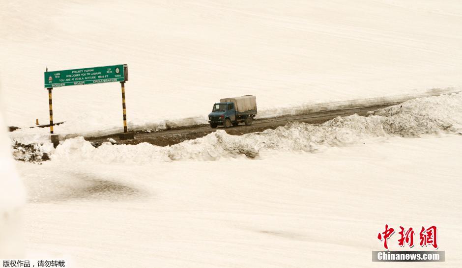 印控克什米尔地区国道部分重开 车辆雪墙中穿梭