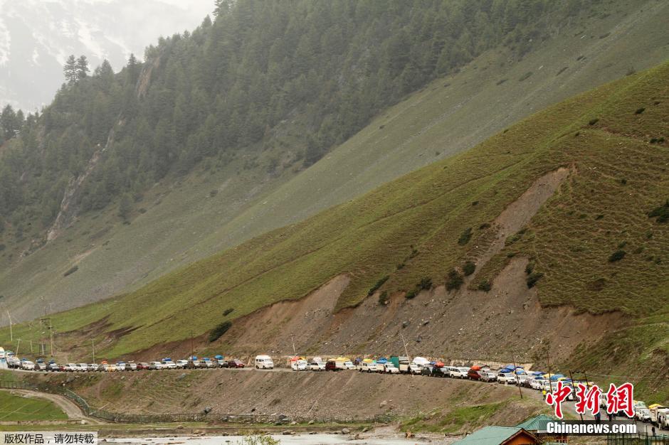 图为斯利那加——列城国道上排长队的汽车。