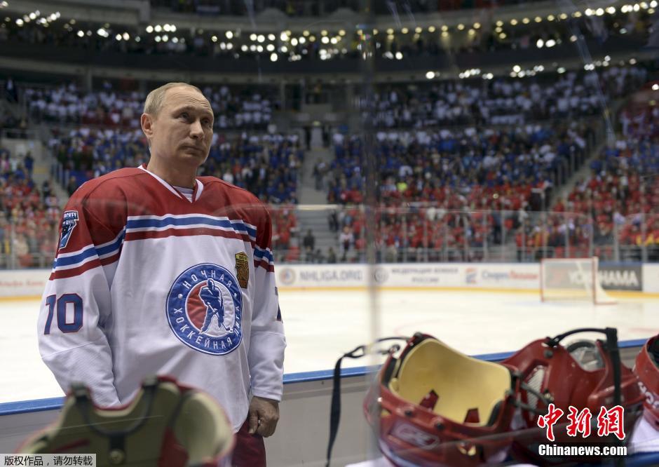 当地时间2015年5月16日,俄罗斯索契,俄罗斯总统普京参加俄罗斯业余选手和冰上曲棍球退役运动员之间进行的冰上曲棍球比赛,最终普京队以18比6获胜,其中普京赢得8球。