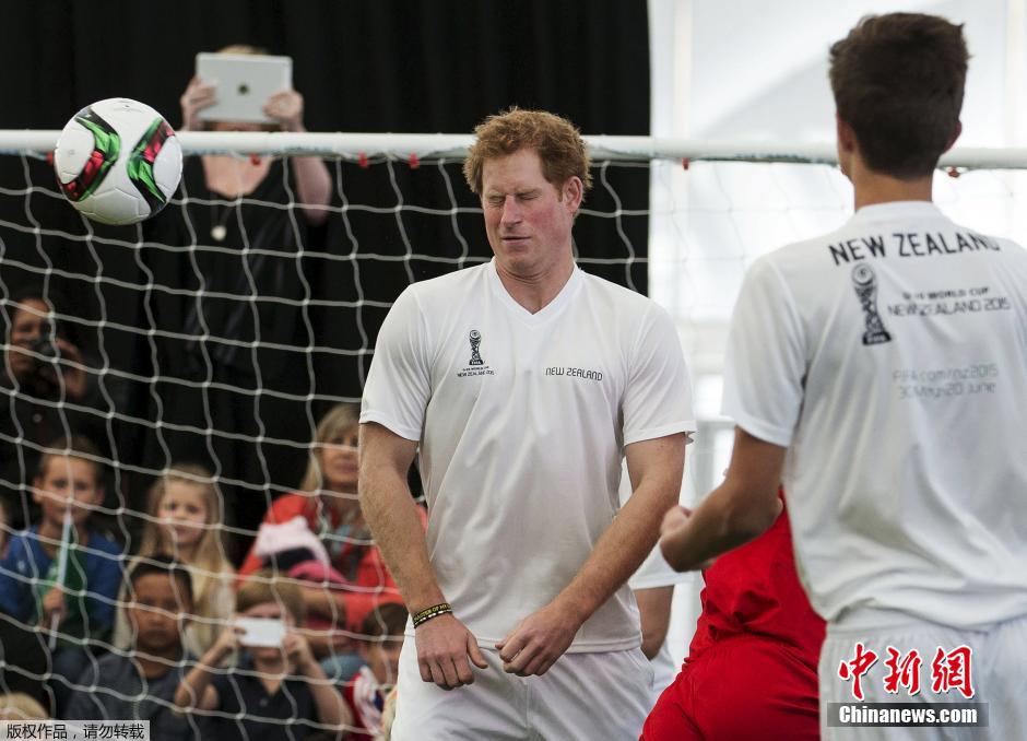当地时间2015年5月16日,新西兰奥克兰,英国哈里王子访问新西兰,与当地足球俱乐部的少年踢足球互动。