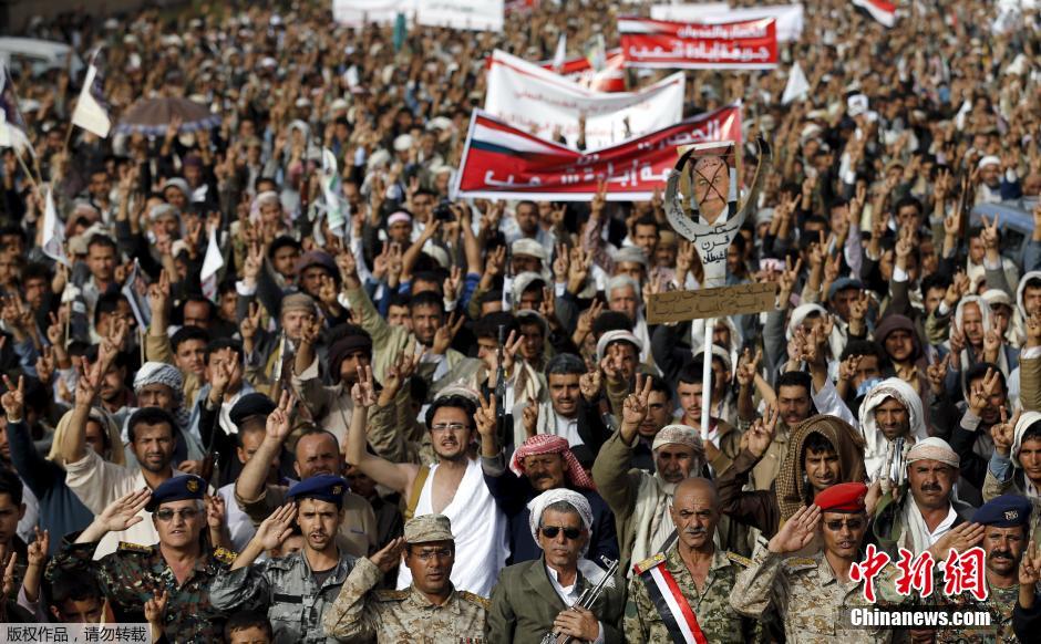 当地时间2015年5月18日,也门萨那,也门什叶派胡赛武装支持者组织游行,抗议沙特联军空袭。