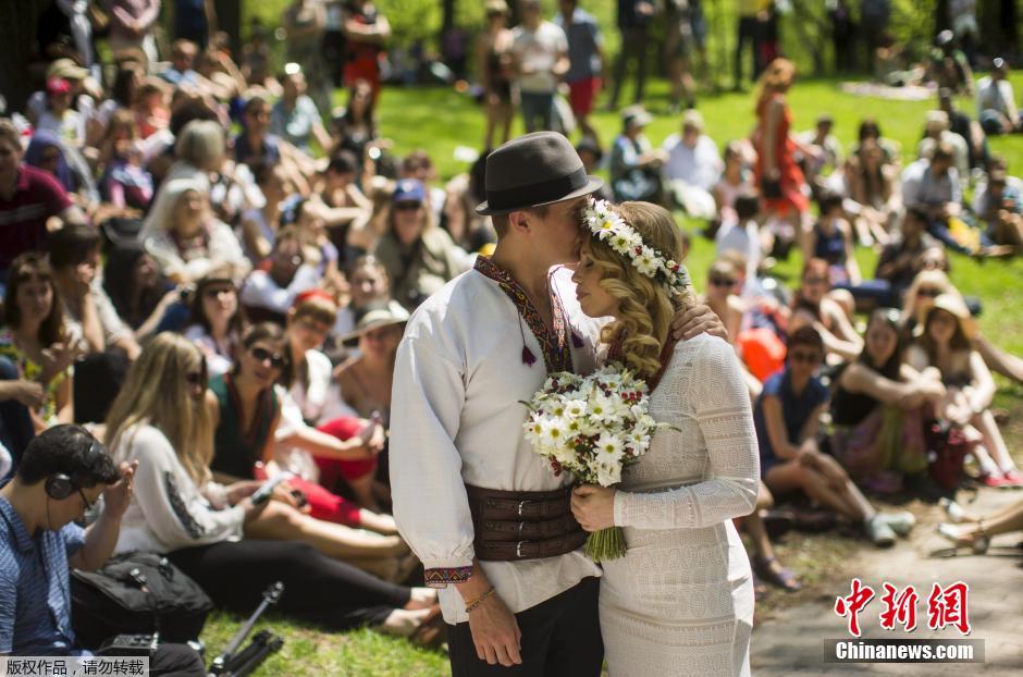 当地时间5月17日,来自乌克兰的Kudriavtseva和来自加拿大的Marczyk举行了他们的婚礼。二人在2014年1月的基辅广场上相遇,相恋一年多之后,选择在多伦多的一个街头的公园举办自己的婚礼。新郎带着新娘穿过市中心的商场、餐厅、街道,和沿途的市民一起分享新婚之喜。