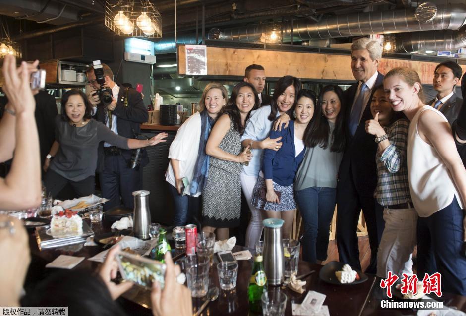 当地时间2015年5月18日,韩国首尔,美国国务卿克里造访首尔餐厅Vatos Urban Tacos,该餐厅是三个韩裔美国人创办的,主要经营融合韩国和美国及墨西哥风味的菜肴。