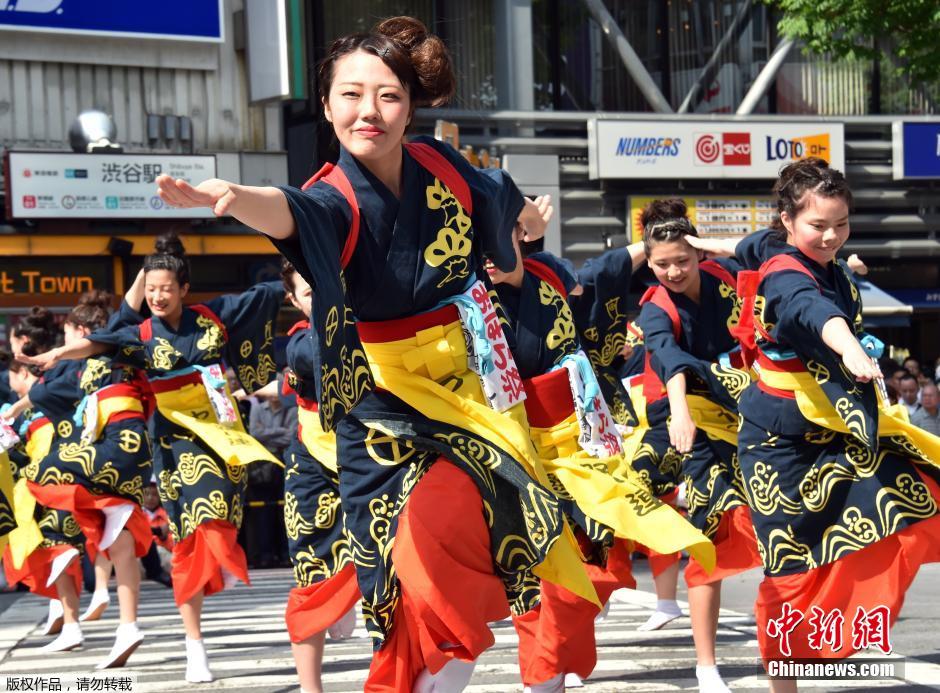 当地时间2015年5月17日,日本东京,当地举行小原祭庆典活动,2600名舞者身着日本传统服装上街庆祝。