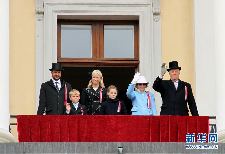 5月17日,在挪威首都奥斯陆,挪威王室成员在王宫阳台观看游行活动。当天,挪威举行游行活动庆祝宪法日。挪威的宪法日也是该国的国庆日,以纪念1814年5月17日通过第一部宪法。 新华社记者 梁有昶 摄 图片来源:新华网