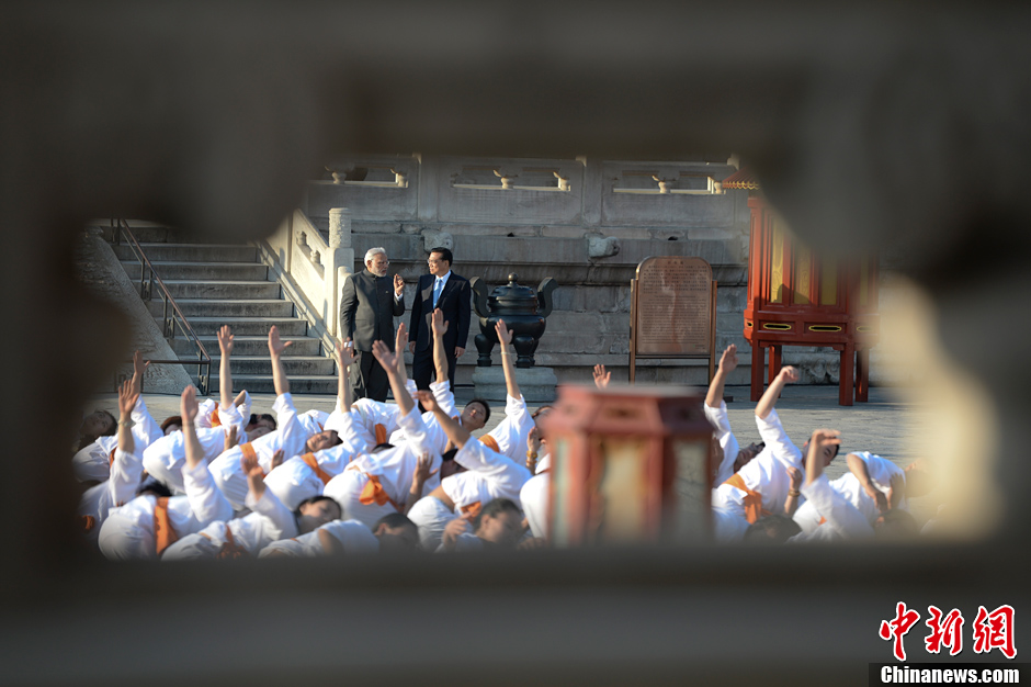 5月15日下午,李克强总理与印度总理莫迪来到天坛祈年殿前,与400多名两国太极、瑜伽爱好者交流互动并观看了演练。一个行云流水,一个柔韧舒展,太极和瑜伽这两大东方文化瑰宝交相辉映。演练结束后,李克强与莫迪共同参观了祈年殿。随后,两人沿着一条林间小路散步交谈。中新社发 廖攀 摄