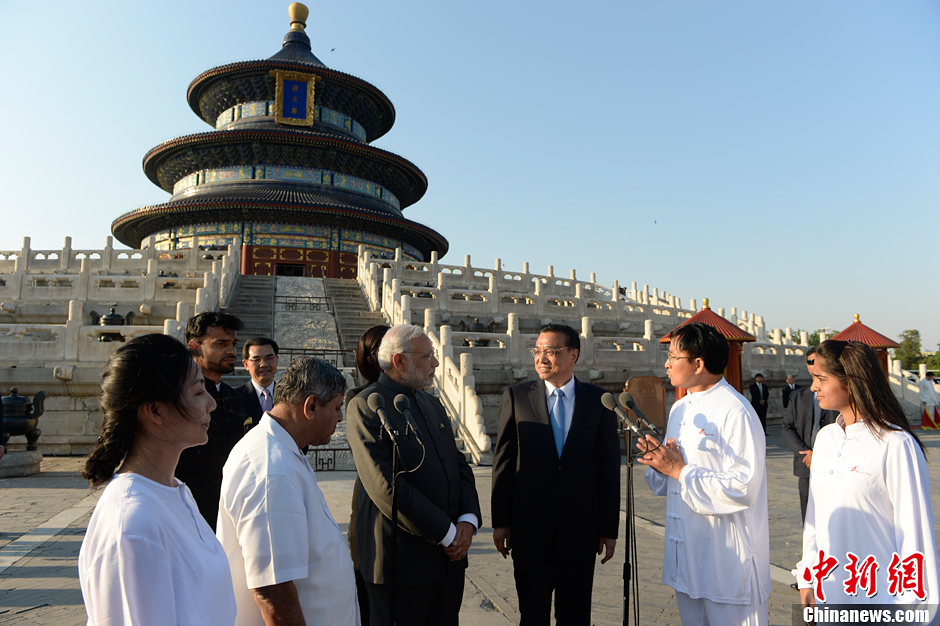 5月15日下午,李克强总理与印度总理莫迪来到天坛祈年殿前,与400多名两国太极、瑜伽爱好者交流互动并观看了演练。一个行云流水,一个柔韧舒展,太极和瑜伽这两大东方文化瑰宝交相辉映。演练结束后,李克强与莫迪共同参观了祈年殿。随后,两人沿着一条林间小路散步交谈。中新社发 廖攀 摄