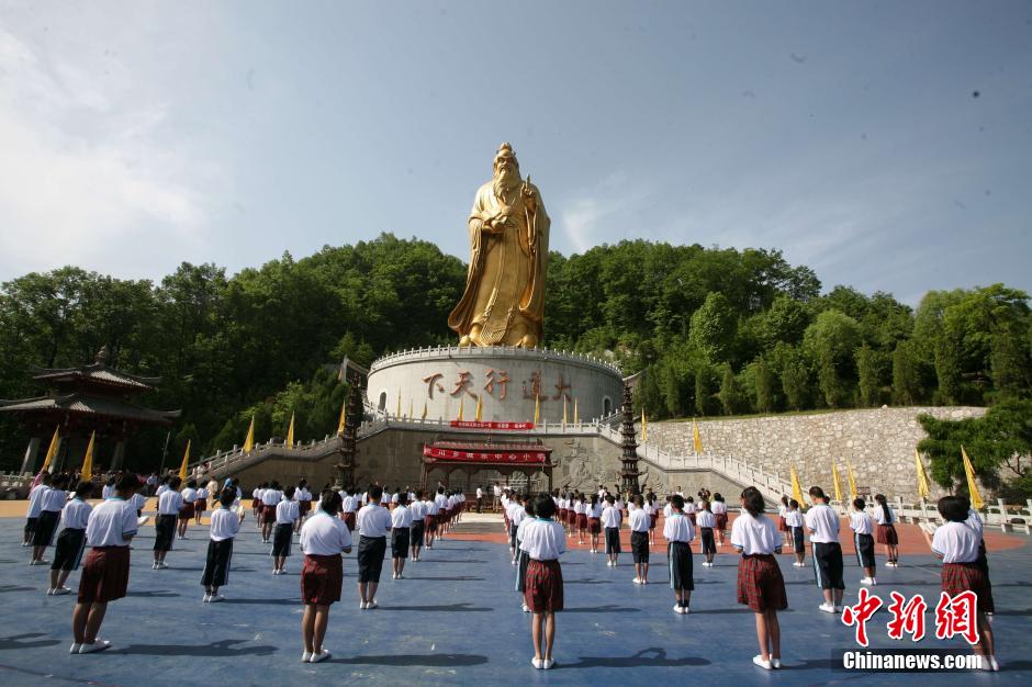 5月18日,河南栾川老君山,一百位来自栾川城东中心小学的学生,聚集在老子归隐地老君山老子铜像下诵读道德经,传承中国传统文化。中新社发 钟欣 摄
