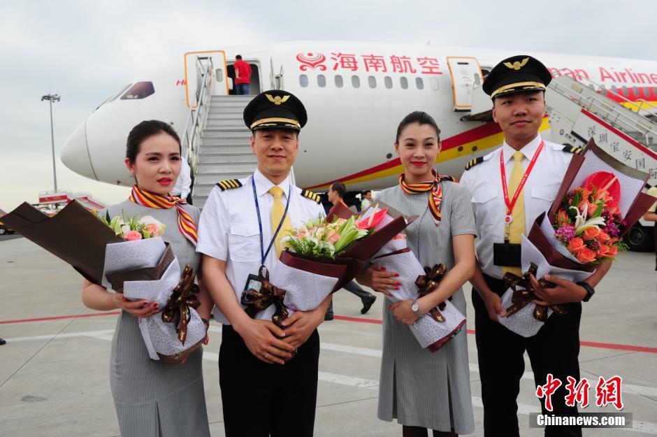 5月13日,海南航空波音787-8梦想飞机首航深圳,成为中国国内首家使用波音787梦想飞机执行深圳地区航班的航空公司。图为该航班机组人员。中新社发 陈文 摄