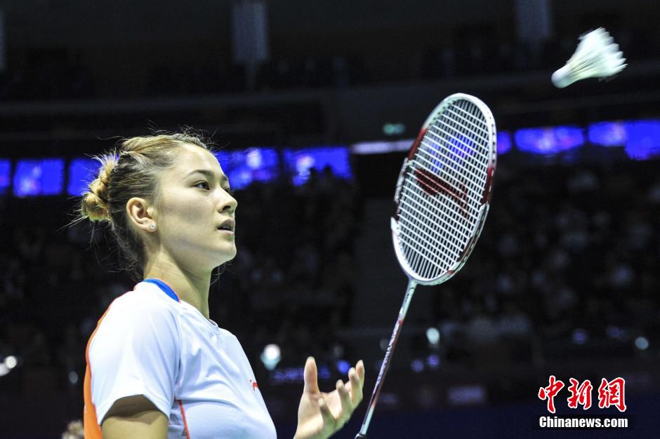 5月13日,澳大利亚女双选手格罗亚在比赛中。当日,在广东东莞市篮球中心进行的2015苏迪曼杯世界羽毛球混合团体锦标赛小组赛中,康有为曾孙女格罗亚征战女双赛场。中新社发 陈骥旻 摄