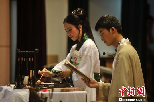 图为参赛选手着古装正在进行创新茶艺竞技。 陈超 摄
