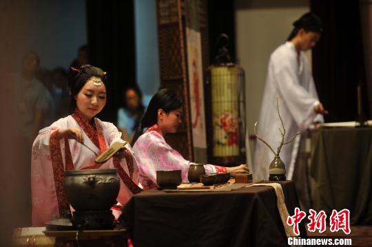 图为参赛选手着古装正在进行创新茶艺竞技。 陈超 摄