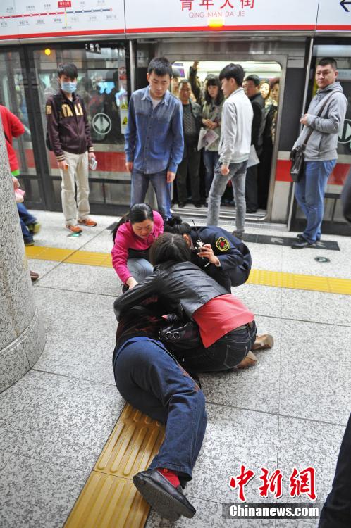 5月13日,辽宁沈阳,早高峰时间段,沈阳地铁1号线青年大街站站台,一自称姓闫的74岁老人在人群中因拥挤而摔倒。涉事的陆女士立即蹲下查看老人伤情,并用自己手包给老人当枕头,地铁工作人员拨打了急救电话并给老人披上衣服保暖。摔倒老人在休息一会后讲出了自己的年龄和姓名,并安慰急得落泪的涉事人:“我有老保,我不讹人”。之后老人被120急救人员用担架抬走送往附近医院。中新社发 孙昊声 摄
