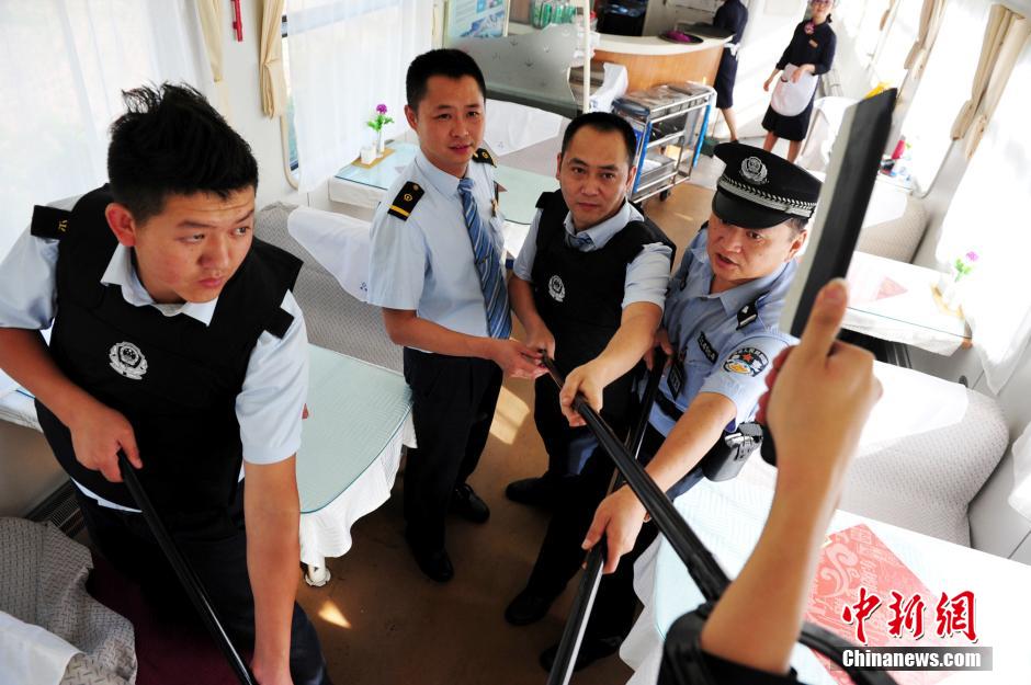 成都铁路公安局西昌公安处攀枝花乘警支队于日前联合铁路客运部门在K118次旅客列车上组织开展反恐防暴处突演练。演练模拟一名旅客突发旅途精神疾病,冲入餐车抢夺厨师菜刀并劫持一名列车工作人员。列车乘警闻讯立即赶到现场与嫌疑人交谈稳定其情绪,由5名列车工作人员组成的处突小组在列车长和乘警长的指挥下,采取迂回包抄、突然攻击的方式将嫌疑人妥善控制,解救了被劫持了列车工作人员。安源 摄