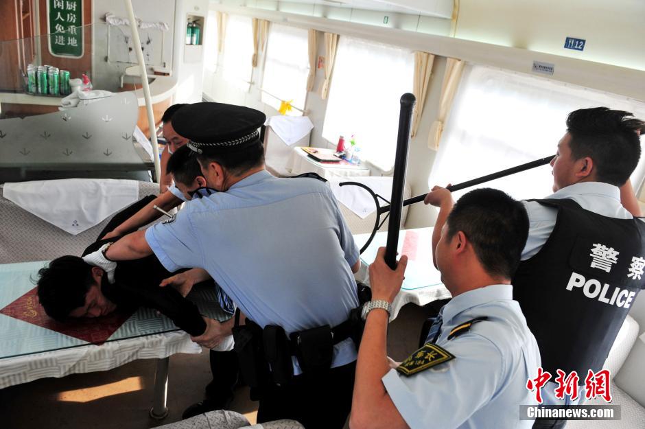 成都铁路公安局西昌公安处攀枝花乘警支队于日前联合铁路客运部门在K118次旅客列车上组织开展反恐防暴处突演练。演练模拟一名旅客突发旅途精神疾病,冲入餐车抢夺厨师菜刀并劫持一名列车工作人员。列车乘警闻讯立即赶到现场与嫌疑人交谈稳定其情绪,由5名列车工作人员组成的处突小组在列车长和乘警长的指挥下,采取迂回包抄、突然攻击的方式将嫌疑人妥善控制,解救了被劫持了列车工作人员。王晓丹 摄