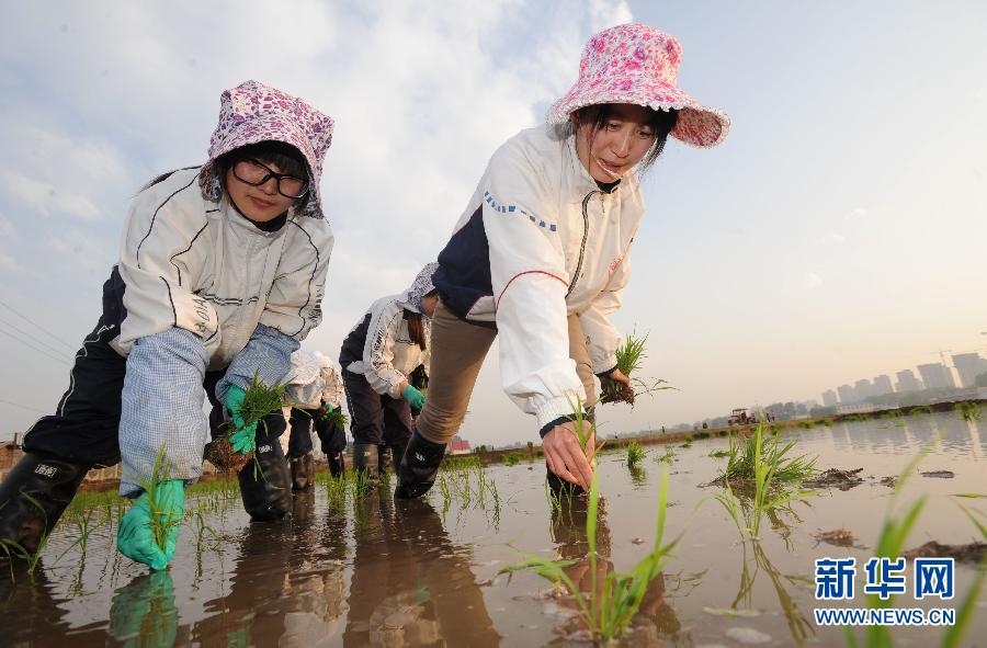 5月18日,沈阳农业大学的博士研究生范名宇(左)、毕文静在校园水稻试验田里插秧。当日,沈阳农业大学在校园里开辟的百亩超级水稻试验田里一片忙碌,插秧工作陆续展开。据了解,该试验田全部由学生自已耙地、播种、插秧、管理,不仅锻炼了学生的动手能力、培养了吃苦精神,还有助于学生将书本上学习的知识应用到实践中。新华社发(张文魁 摄)