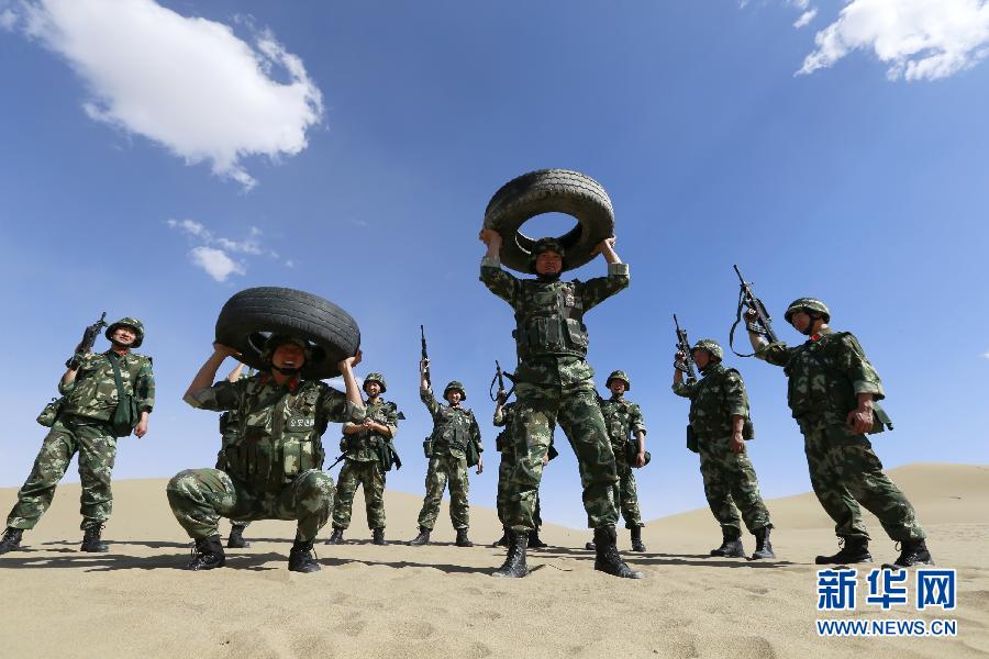 5月18日,内蒙古阿拉善盟边防支队官兵开展举轮胎比赛练兵活动。当日,内蒙古阿拉善盟边防支队结合任务实际,将机动部队带到沙漠地区开展大练兵活动。练兵旨在提升官兵的军事技能和处突能力,为圆满完成各项任务打下基础。新华社发(托娅 摄)