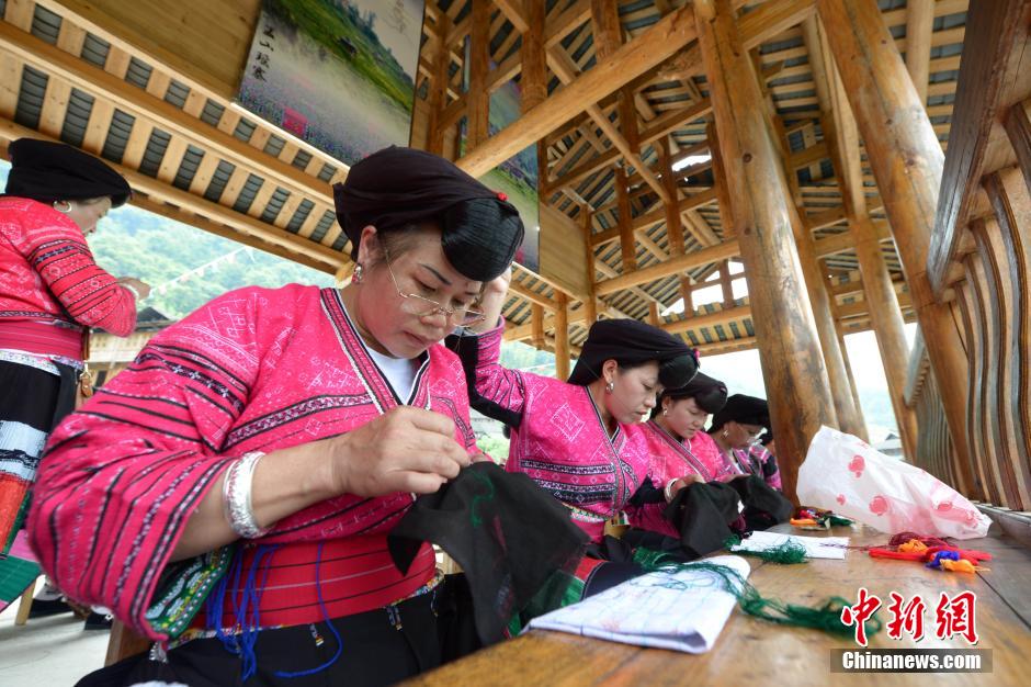 5月19日,在广西龙胜各族自治县泗水乡白面瑶寨,当地红瑶妇女在进行刺绣比赛。当日是第五个“中国旅游日”,龙胜开展大量文明旅游宣传等活动,进一步提升当地旅游满意度和旅游品位,推动该县旅游业健康持续发展。中新社发 韦吉阳 摄