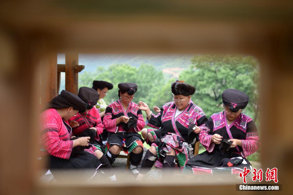 5月19日,在广西龙胜各族自治县泗水乡白面瑶寨,当地红瑶妇女在进行刺绣比赛。当日是第五个“中国旅游日”,龙胜开展大量文明旅游宣传等活动,进一步提升当地旅游满意度和旅游品位,推动该县旅游业健康持续发展。中新社发 韦吉阳 摄