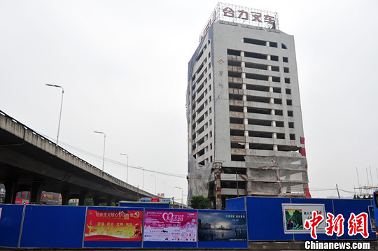 5月19日5时30分,安徽省合肥市望江路与金寨路交口15层,合力大厦缓缓向西倒下,准确倒在指定区域内。中新社发 张娅子 摄