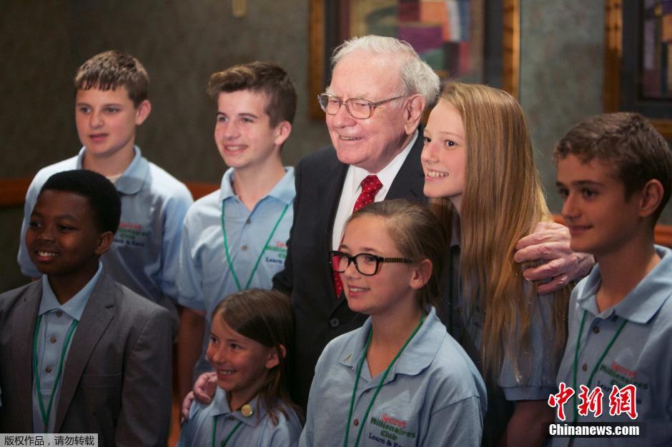 当地时间2015年5月18日,美国奥马哈,巴菲特会晤美国年度儿童创业大赛“创业成长竞赛”的决赛选手。这项竞赛已经连续第四年举行,此次吸引了超过4000名年龄在7岁和14岁儿童少年参加。这项比赛是巴菲特的“秘密百万富豪俱乐部”企划的一部分,宗旨为启发小朋友的金融知识与创业精神。